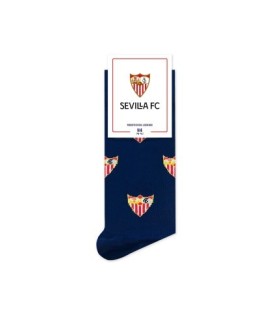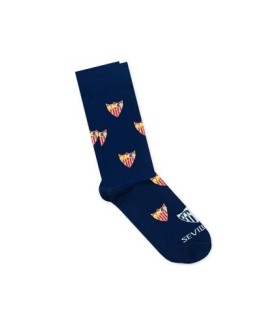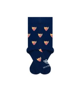 Calcetines oficiales del Sevilla FC diseñados por Pepe Pinreles, con múltiples escudos pequeños. Disponibles en azul marino.