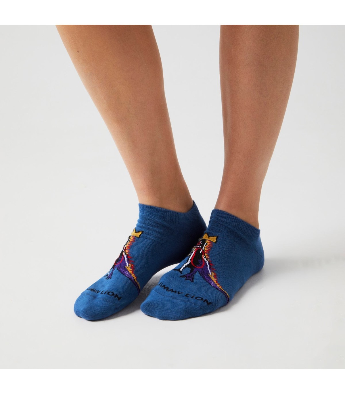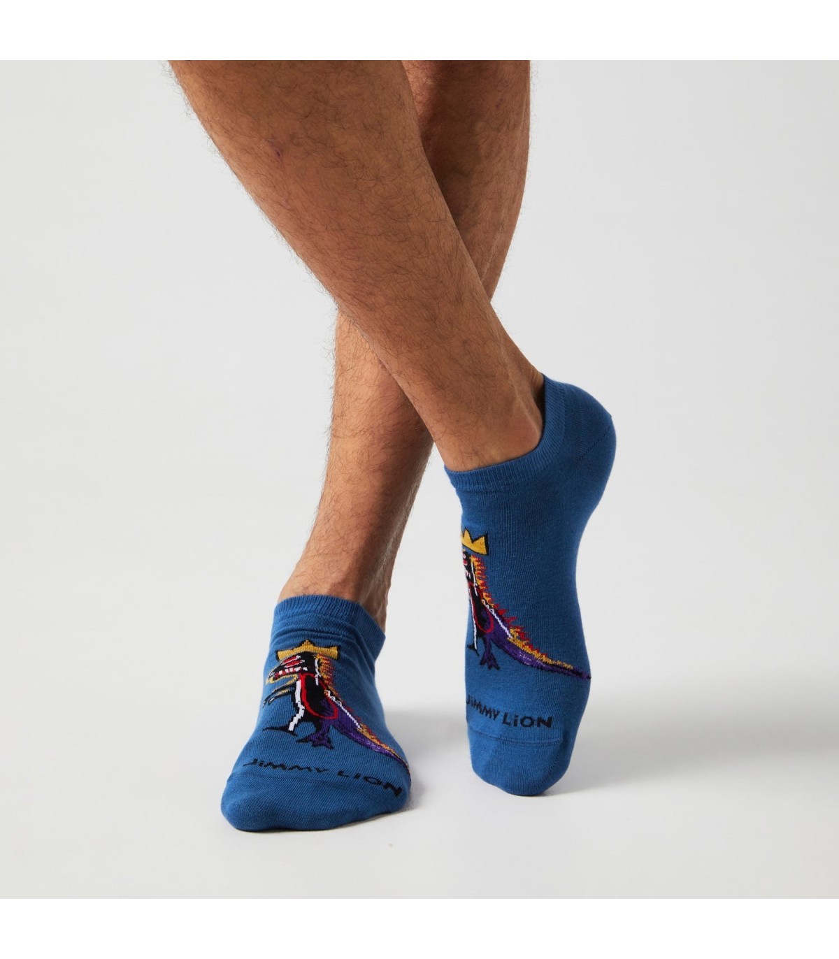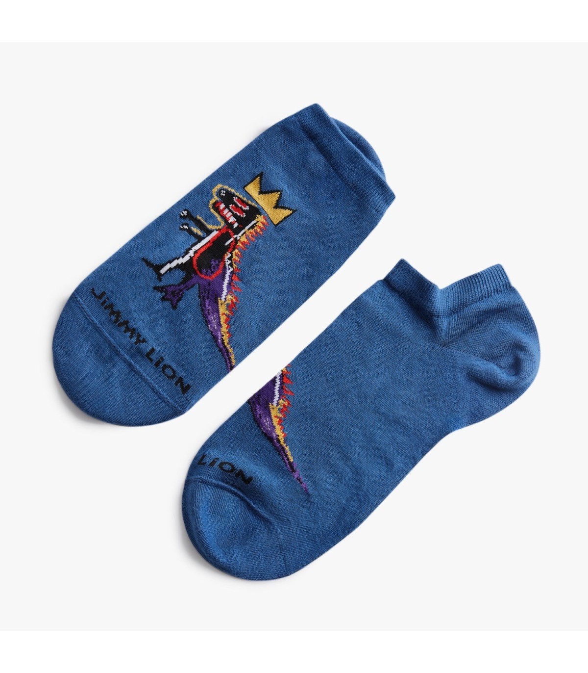 Calcetines tobilleros azules con diseño de dinosaurio y corona de Basquiat, ofreciendo un estilo artístico y moderno.