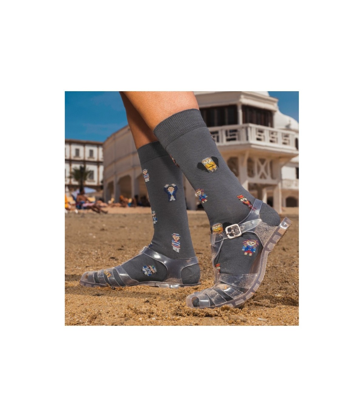 Calcetines que homenajean las comparsas de Juan Carlos Aragón, ideales para los aficionados al Carnaval gaditano y su música.