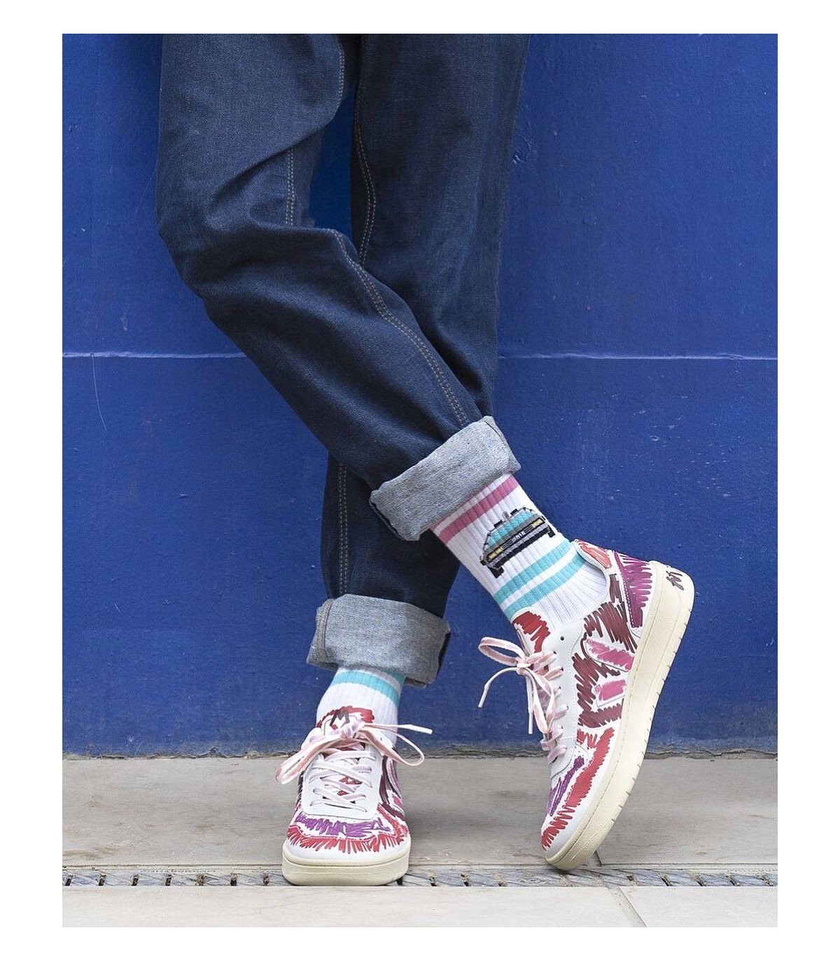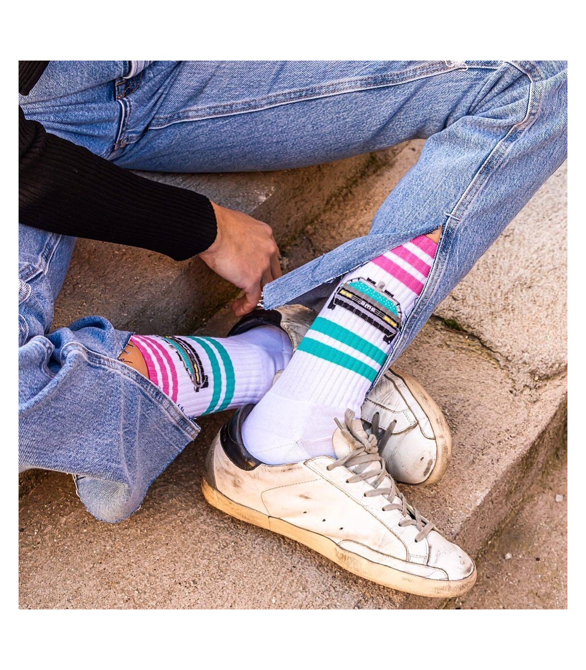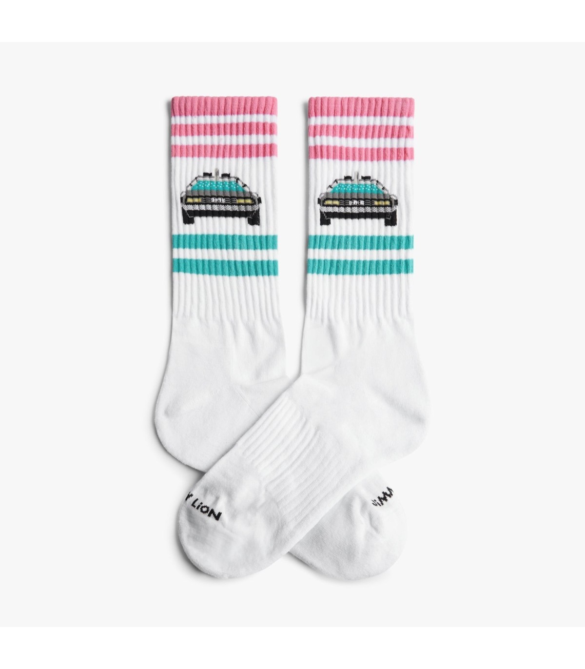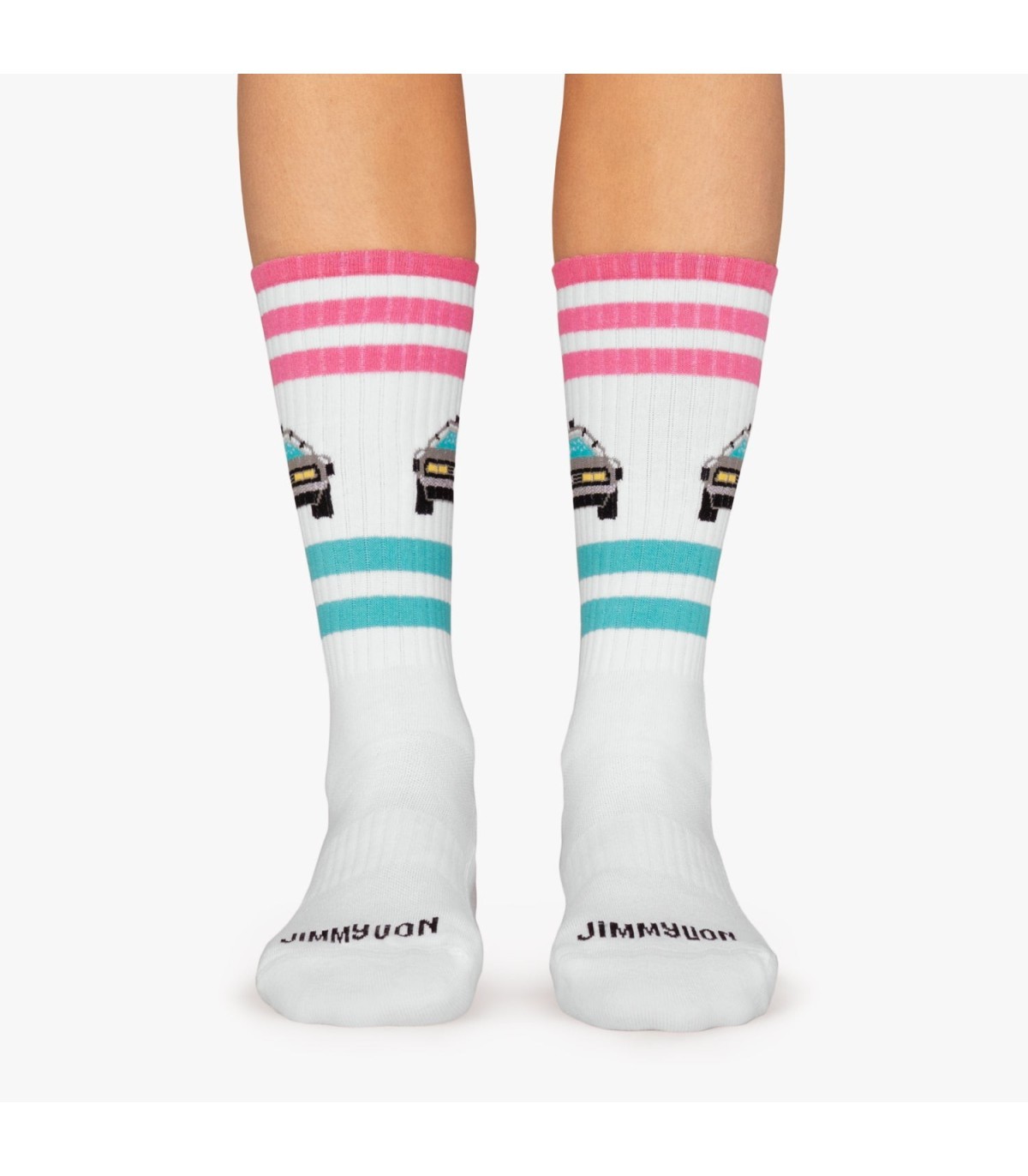¡Viaja en el tiempo con estilo gracias a los calcetines "Athletic DeLorean" de Jimmy Lion! Inspirados en el icónico coche de "Regreso al Futuro", estos calcetines deportivos de media caña presentan un diseño retro con franjas en tonos rosa y turquesa sobre fondo blanco, y una detallada ilustración del DeLorean en el lateral. Fabricados con algodón peinado de alta calidad, ofrecen comodidad y transpirabilidad, ideales para tus aventuras diarias.