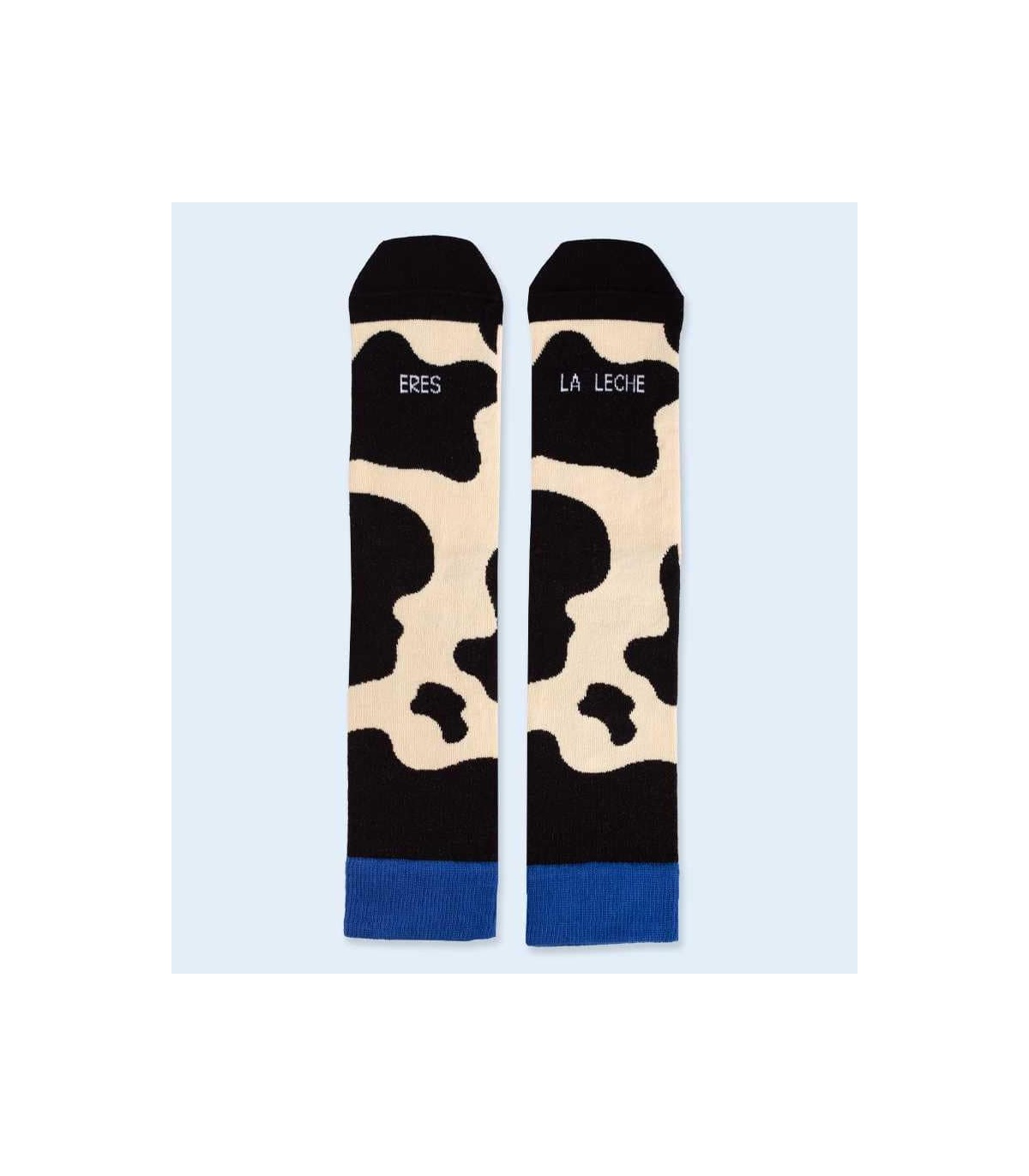 Calcetines divertidos con diseño de manchas negras y beige que imitan la piel de una vaca, acompañados de la frase "Eres la leche". Fabricados con materiales de alta calidad para garantizar comodidad y durabilidad.