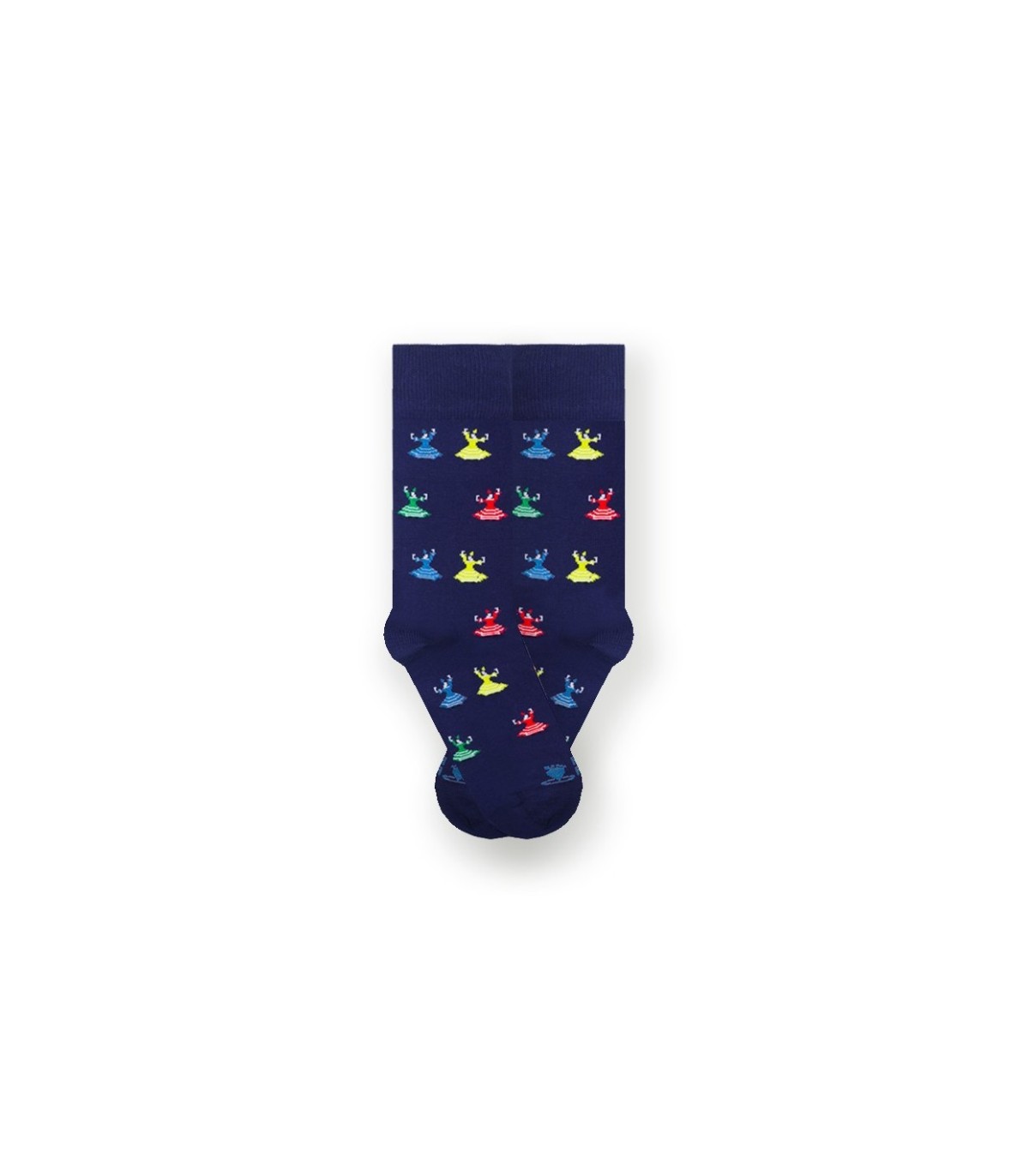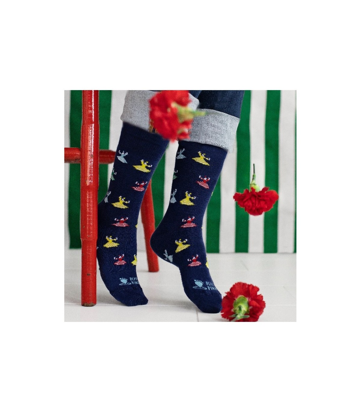 Calcetines con diseño de trajes de flamenca, disponibles en azul marino o naranja.