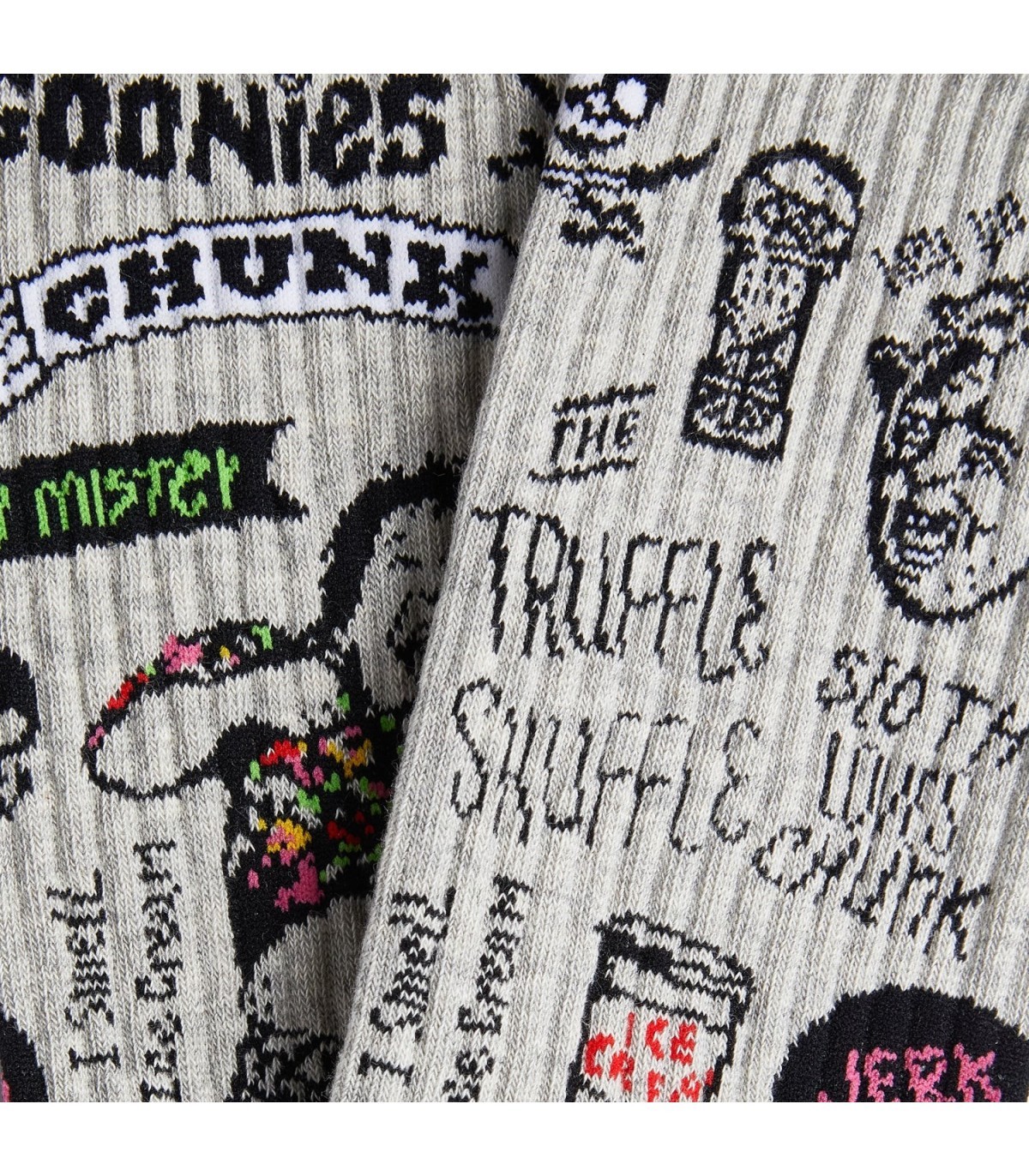 Calcetines grises inspirados en "Los Goonies", con ilustraciones y frases emblemáticas de la película.