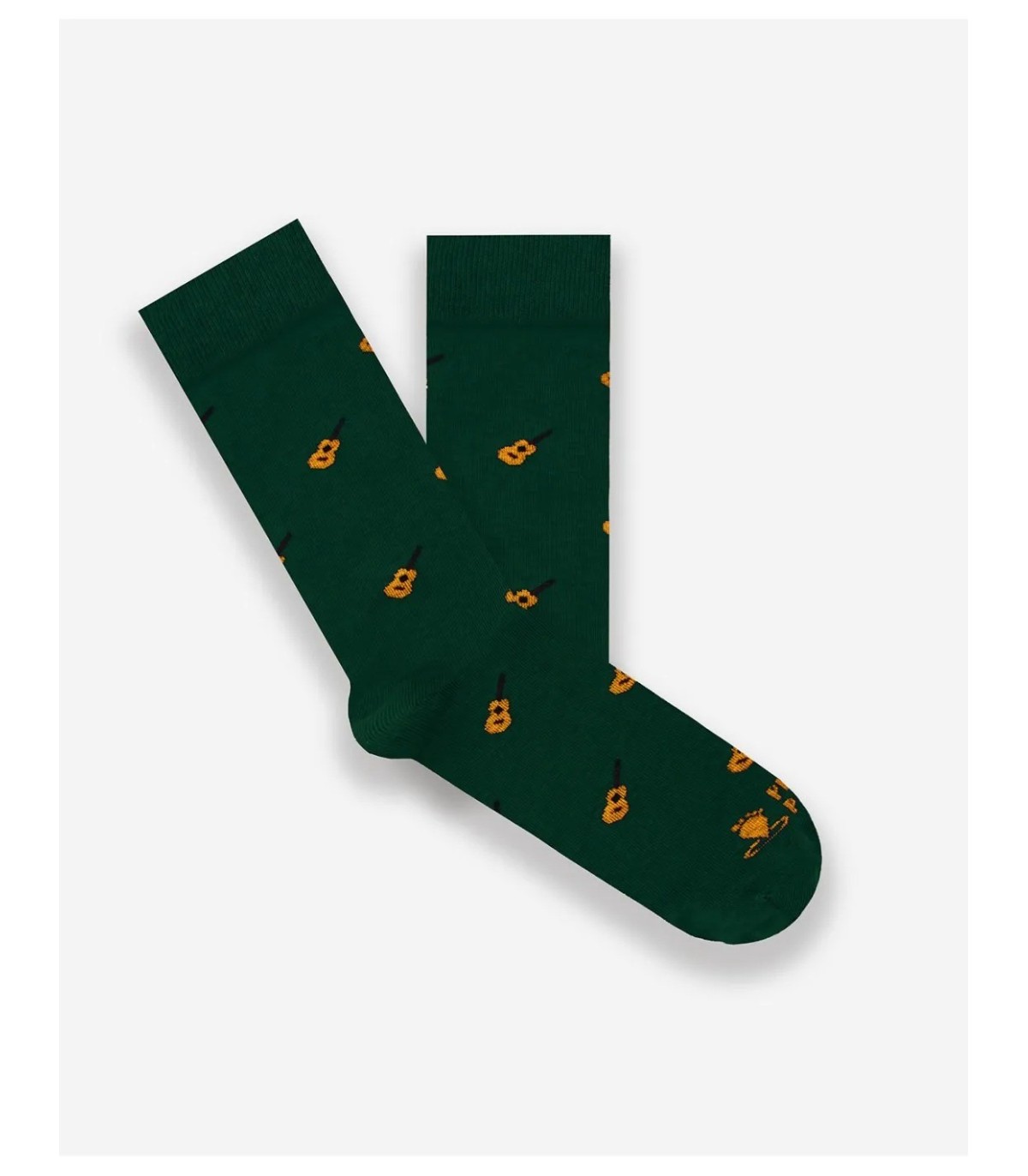 Calcetines en verde con diseño de guitarras, ideales para los amantes de la música y el estilo