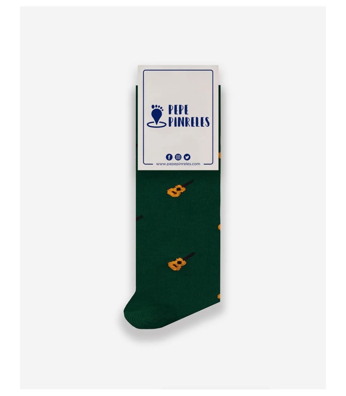 ¡Añade ritmo a tu atuendo con los calcetines de guitarras de color verde de Pepe Pinreles! Estos calcetines presenta un diseño vibrante de guitarras, rindiendo homenaje a la rica tradición musical de España.