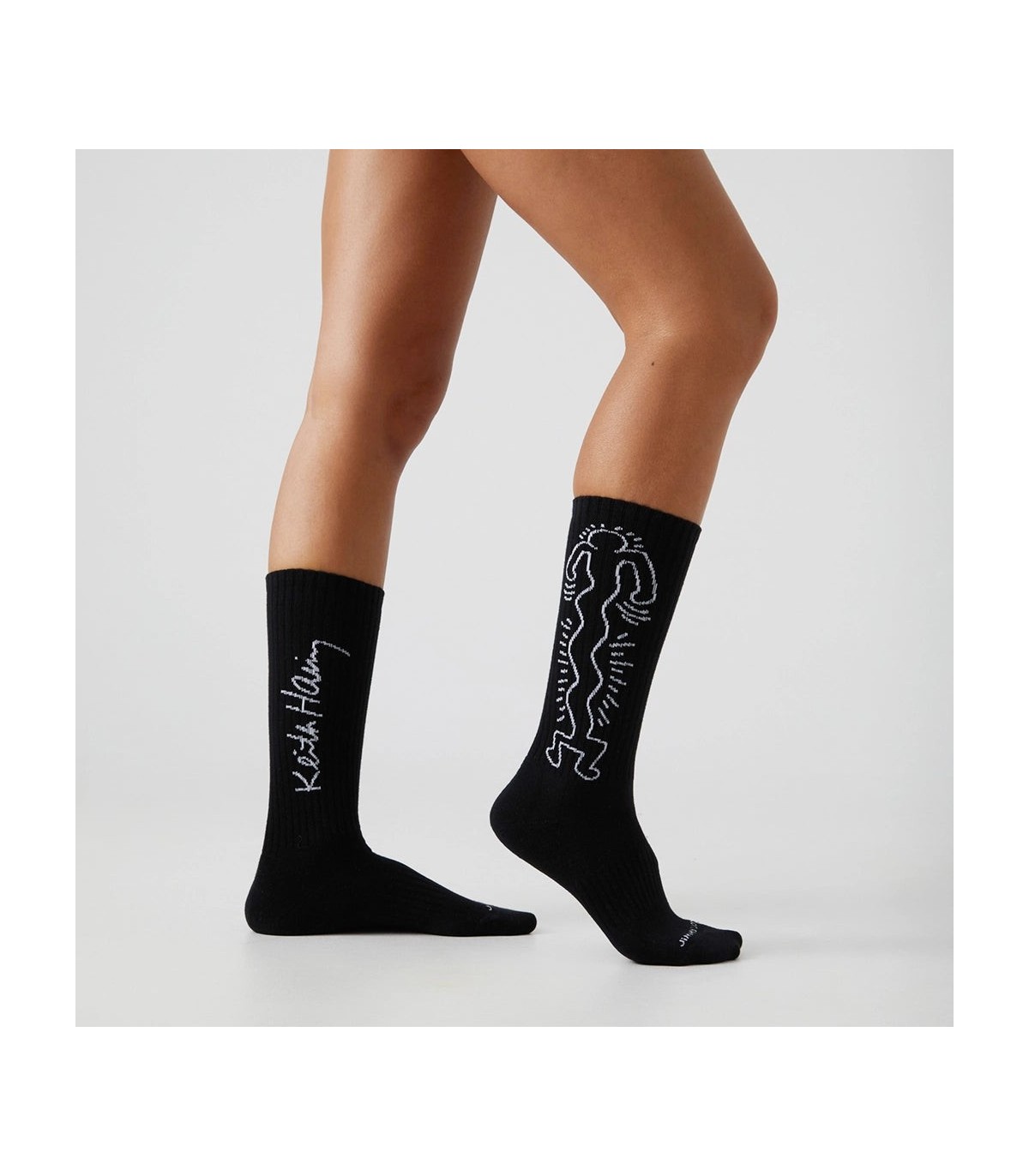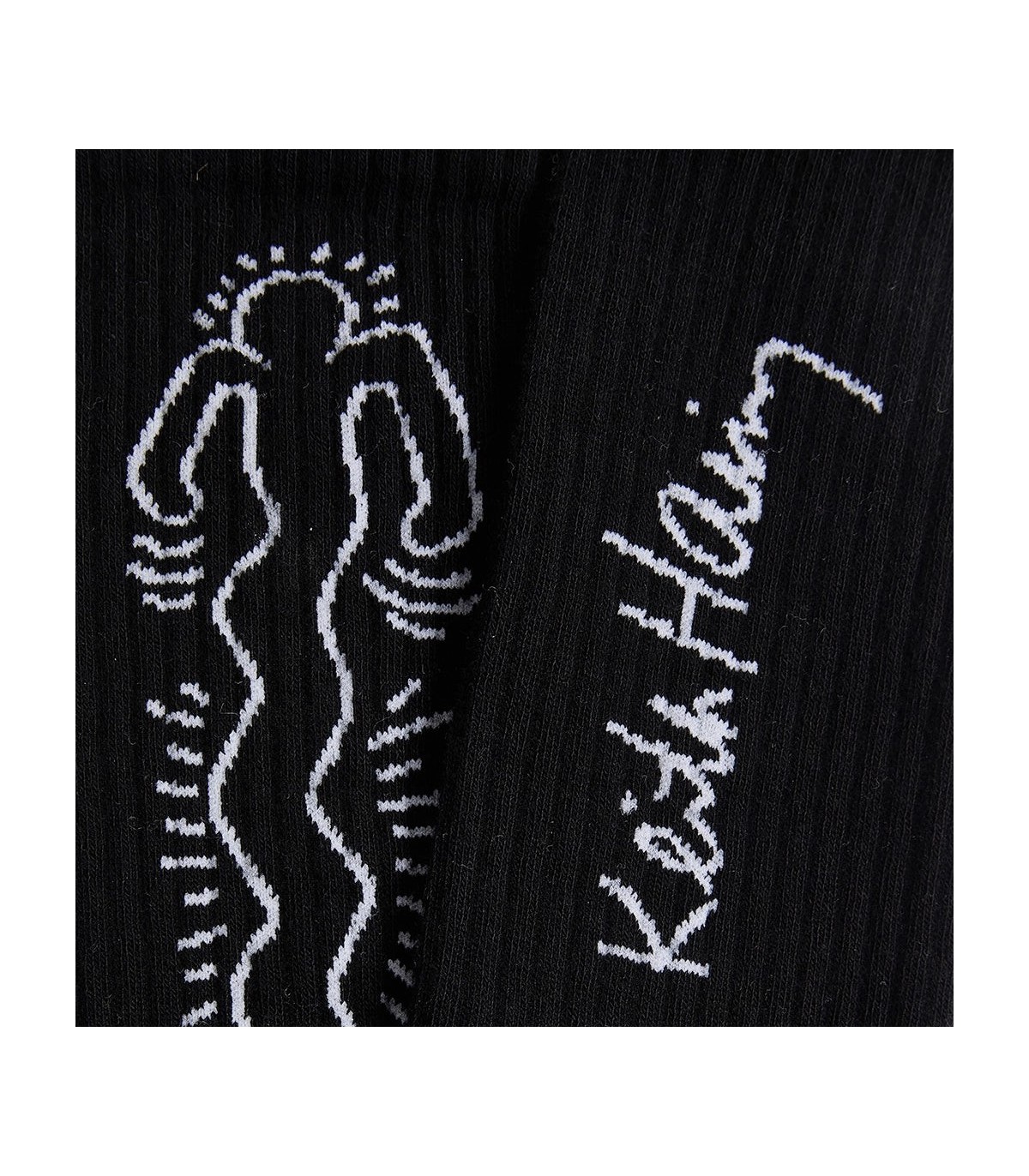 Calcetines deportivos con diseño de figuras danzantes de Keith Haring, fusionando arte y energía.