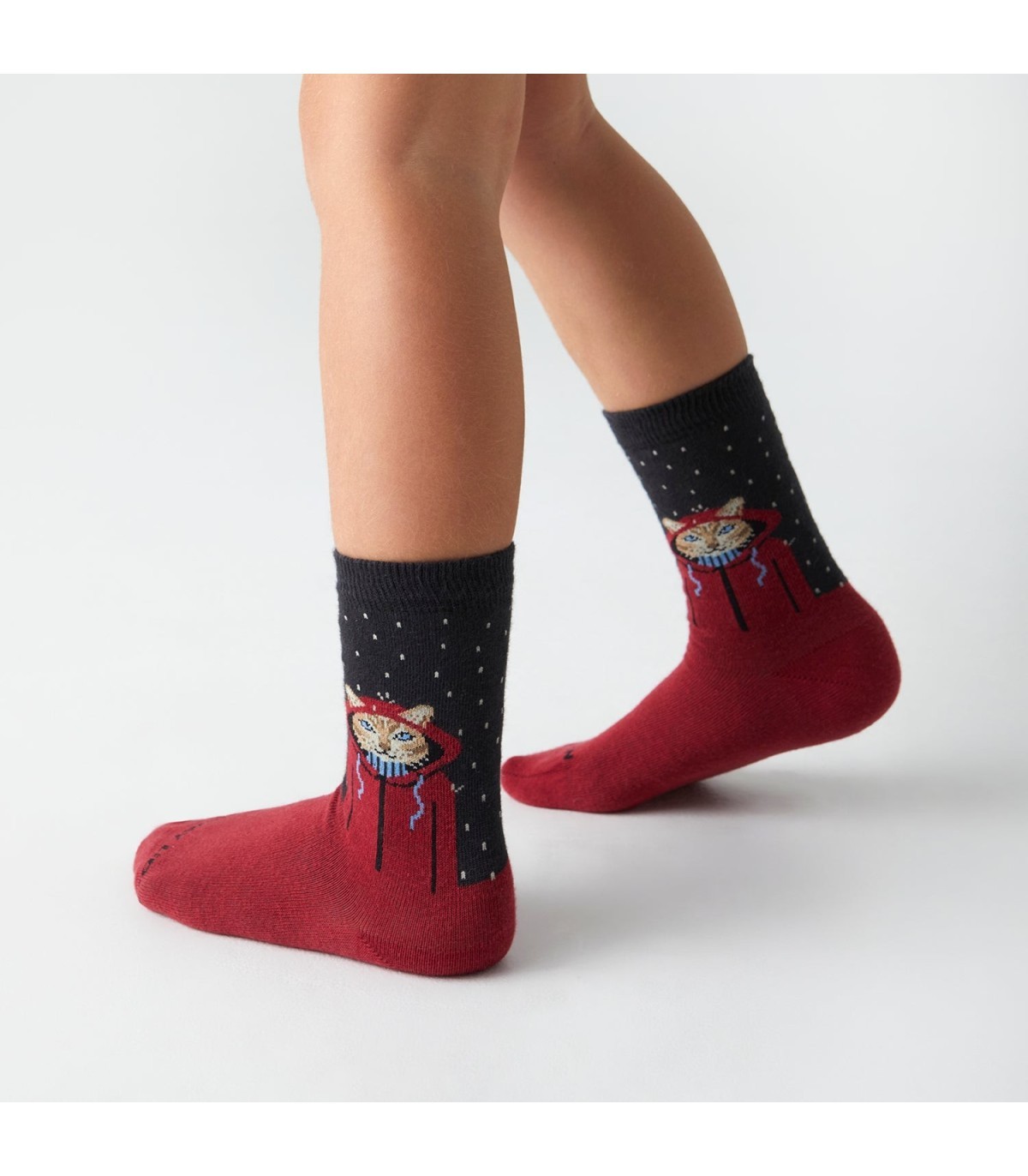 Calcetines infantiles de media caña con diseño de gato bajo la lluvia, fabricados con algodón orgánico para máxima comodidad.