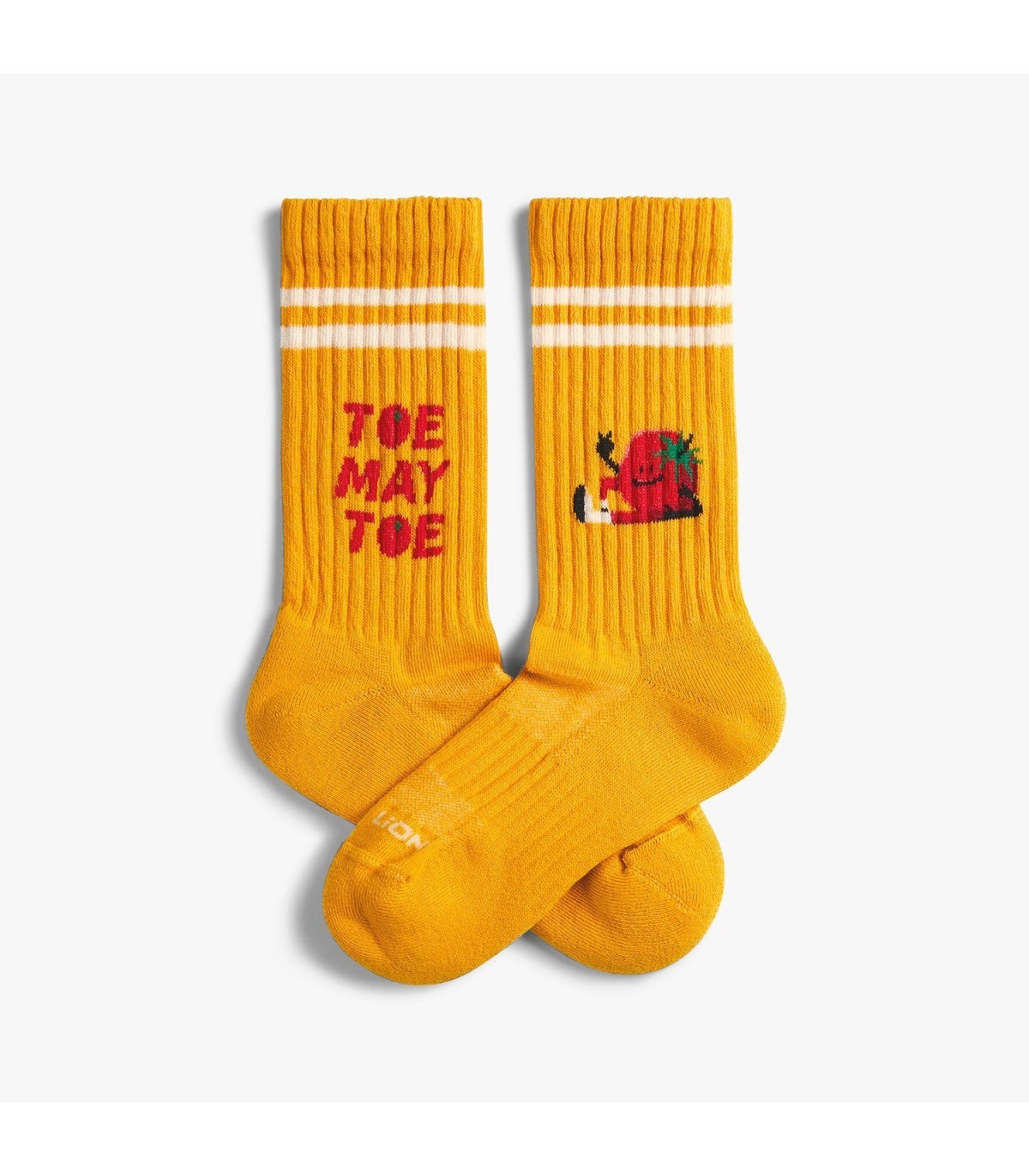 ¡Haz que las frutas y verduras sean emocionantes con los calcetines deportivos "Toe-May-Toe" de Jimmy Lion! Este diseño presenta un tomate sonriente y la inscripción "Toe-May-Toe" en un llamativo fondo mostaza. Fabricados con 80% de algodón orgánico, ofrecen transpirabilidad y comodidad para los niños activos.