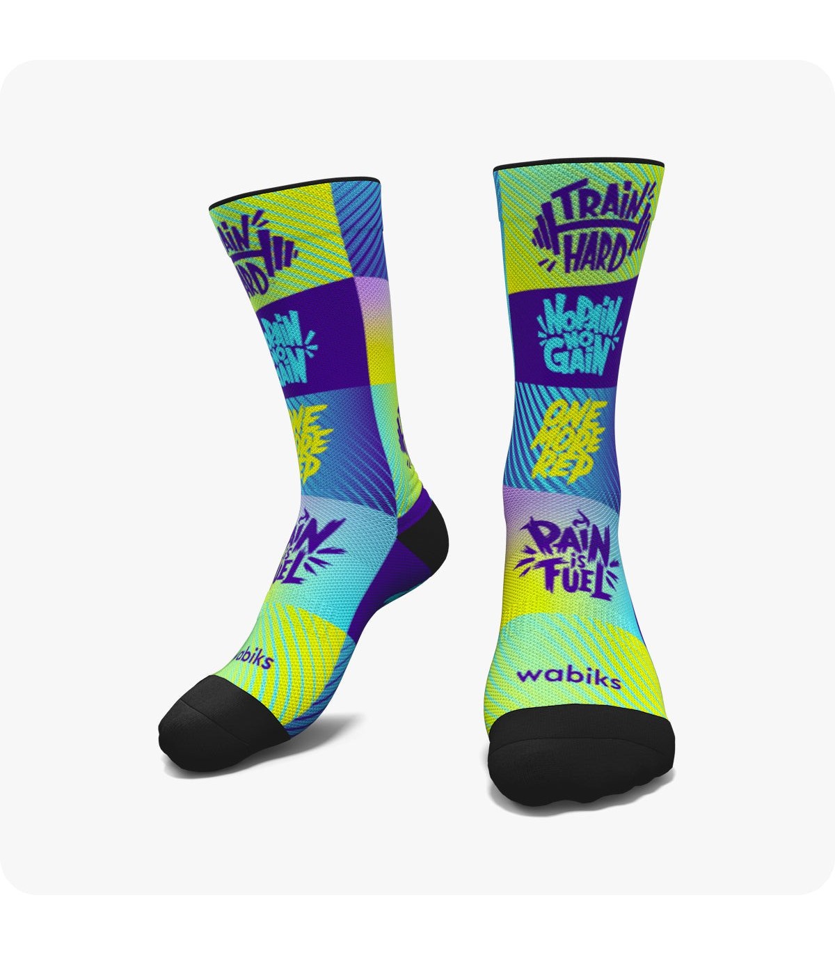Calcetines deportivos azules con mensaje motivacional, cómodos y transpirables para mejorar tu rendimiento.