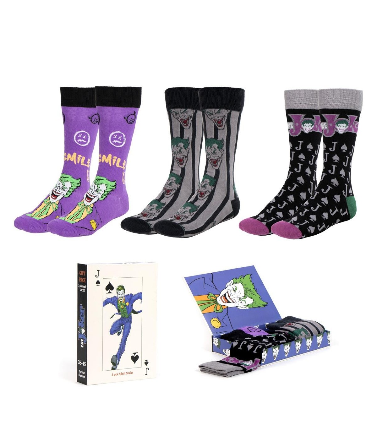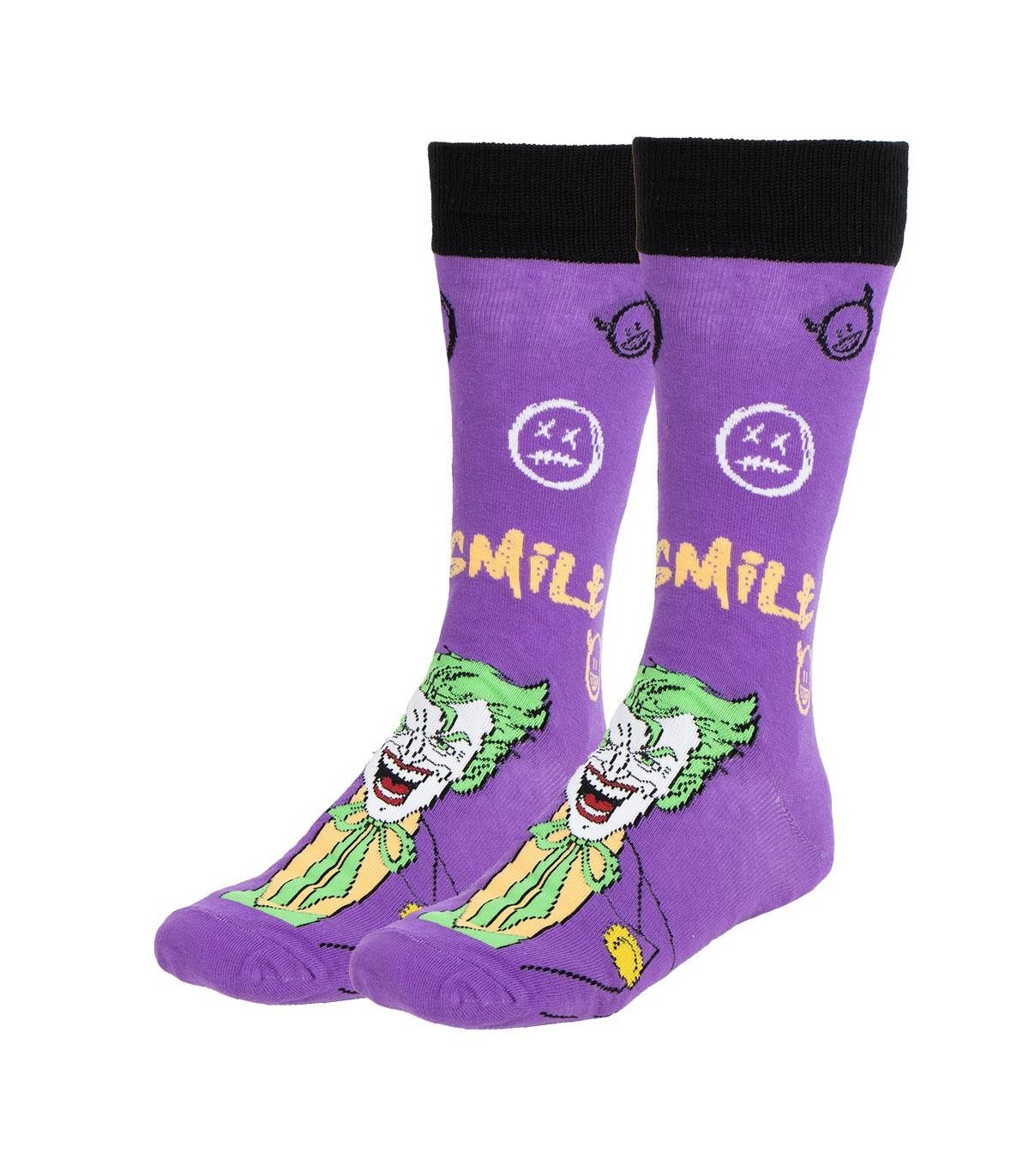 ¡Sumérgete en el universo de Gotham con el pack de 3 calcetines de Batman y Joker de Warner Bros! Este conjunto incluye tres pares de calcetines con diseños únicos del Caballero Oscuro y su archienemigo, el Joker. Fabricados con una mezcla de algodón, poliamida y elastano, ofrecen comodidad y estilo para los verdaderos fanáticos de DC Comics.