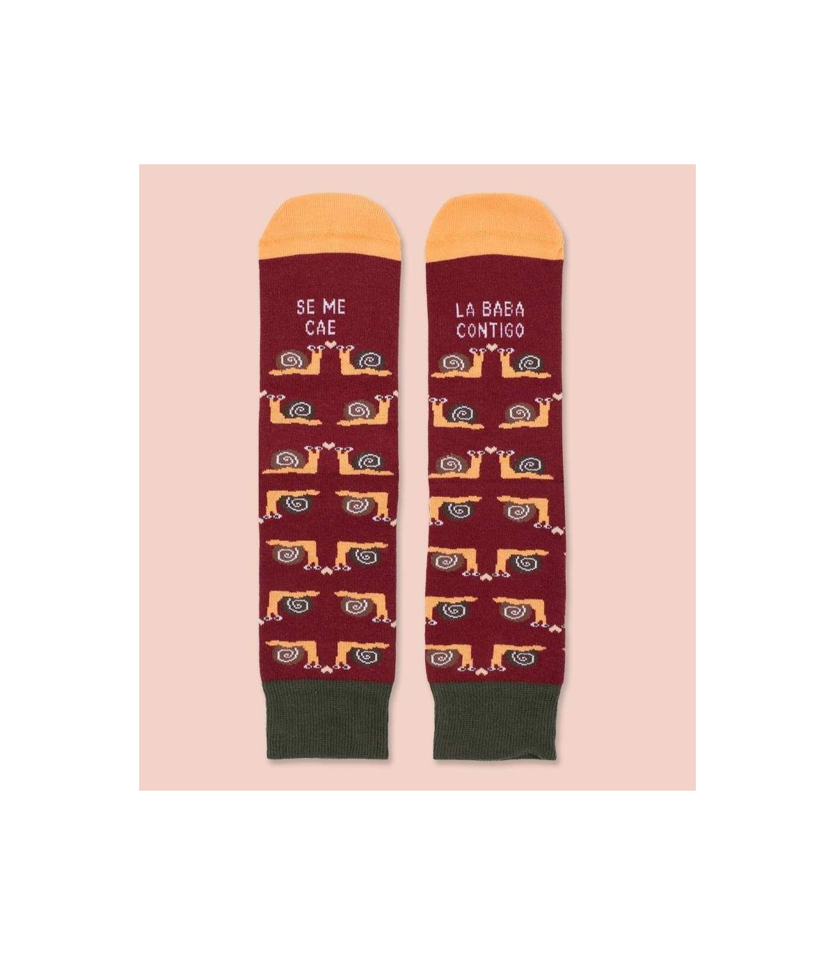Calcetín marrón clarito, con estampados de caracoles y con la frase se me cae la baba contigo