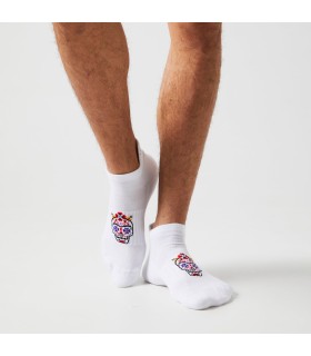 Calcetines tobilleros deportivos blancos con diseño de calavera y flores inspirado en Frida Kahlo, fusionando arte y funcionalidad.