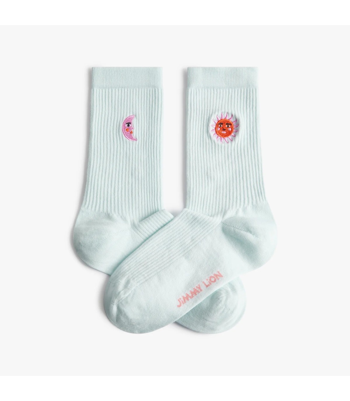 Os traemos unos nuevos calcetines de la marca Jimmy Lion tan sencillos de color azul clarito, con el logo del sol y la luna