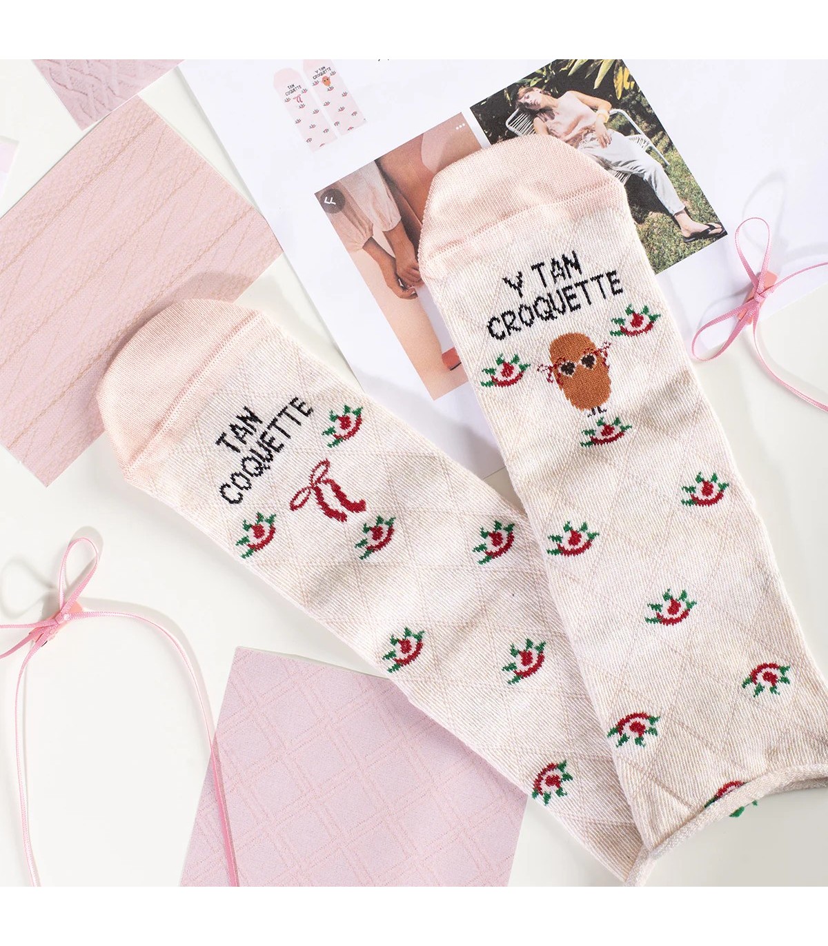 Calcetín largo beis, con rosas de estampado y con frase que pone tan coquette y tan croquette Y con una foto de una croqueta